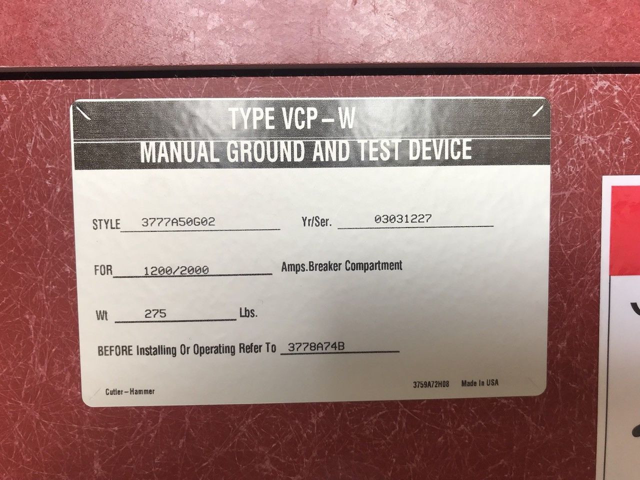 - Cutler Hammer VCP-W Manual Ground And Test Device 1200/2000 Amp