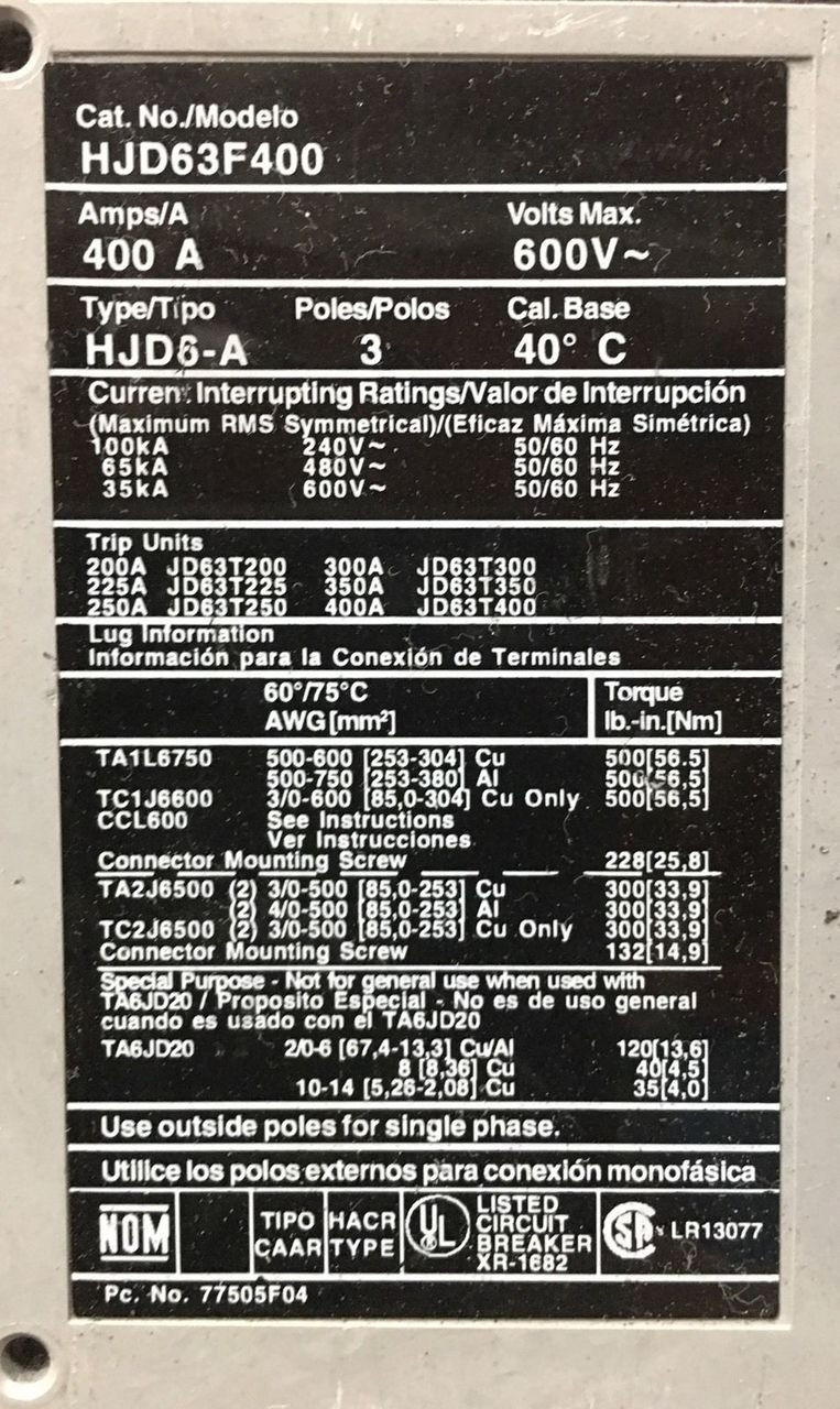 - HJD63F400 Siemens Breaker, 400 Amp, 600V, Reconditioned