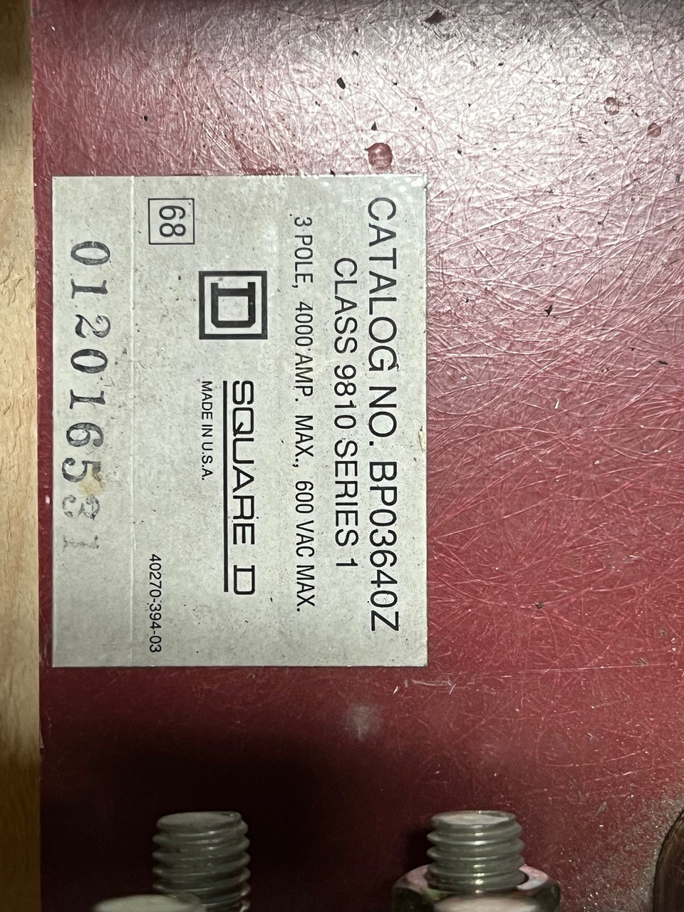 SQUARE D BPO3640Z 4000A, 3 Pole, 600Vac, Bolted Pressure Switch