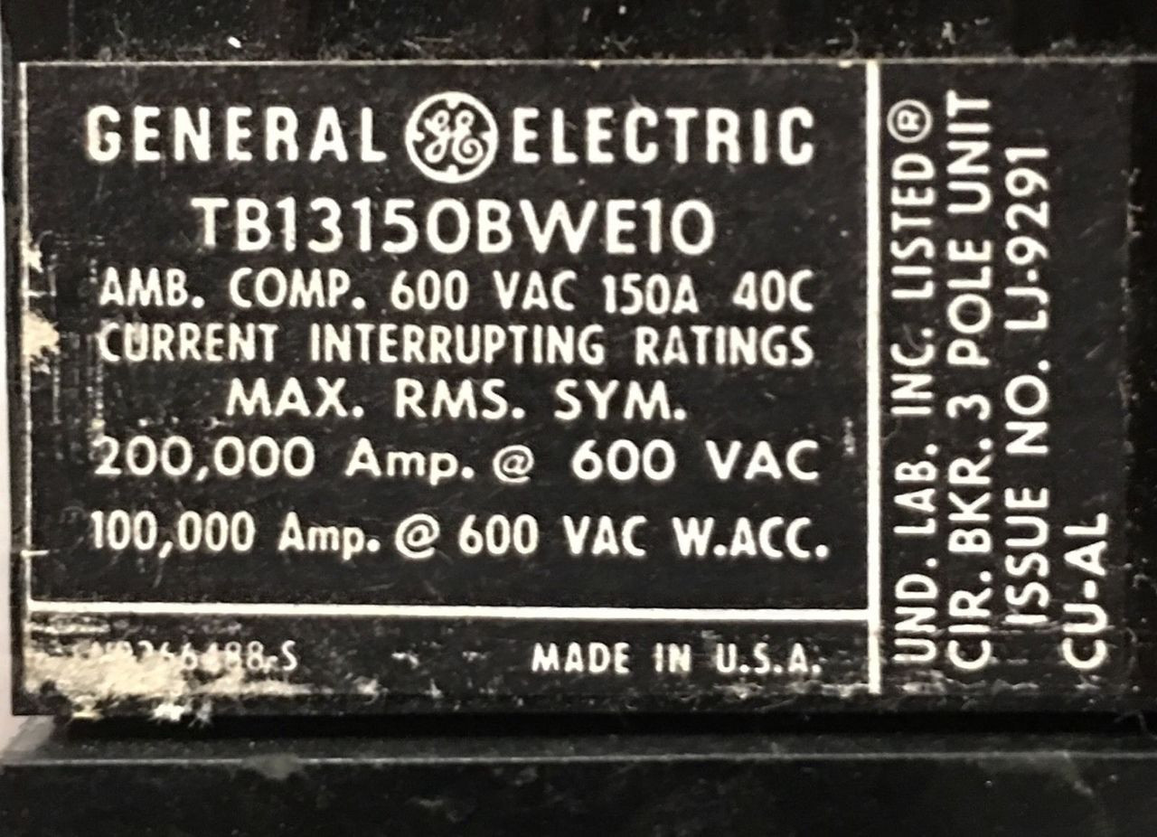 - TB13150BWE10 GE Breaker, 150 Amp, 600V, Reconditioned, Sku 785
